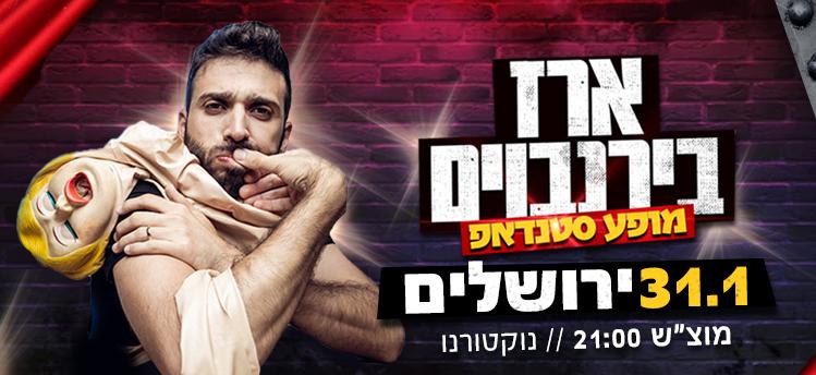 ארז בירנבוים - הסטנדאפיסט היחיד שלא מתאים את עצמו לקהל! המופע של ארז גס, בוטה, בועט ואנרגטי! בלי חוקים ובלי צנזורה... ועם נסיון של למעלה מעשור ואלפי הופעות במועדוני סטנדאפ פאבים ובארים ארז הוא חיית במה. ארז הוא סטנדאפיסט בארים "קלאסי" שיגרום לכם לשפוך את הבירה שלכם יותר מפעם אחת. מומלץ לבוא עם מגבונים לחים למופע.